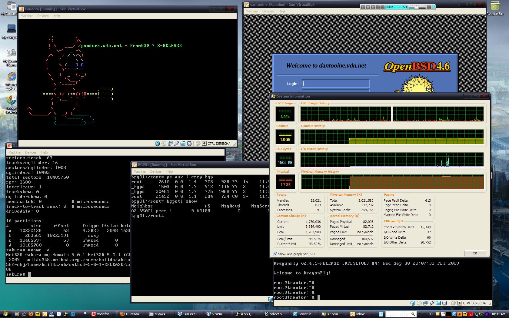 This is my laptop, an HP 6730b with a Core 2 Duo 2.53GHz processor and 2GB of RAM, running 5 VMs with different flavors of BSD along with other applications. The VMs are running OpenBSD 4.6 (two of them, one with XDM), NetBSD 5.0.1, FreeBSD 7.2 and DragonflyBSD 2.4.1 and some of the other applications are AIMP2, TweetDeck, MS Outlook and Console2 with a PowerShell tab.