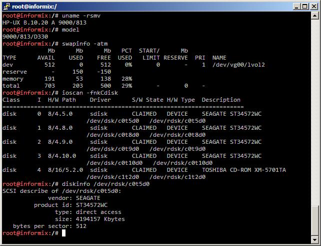 The server has one PA-7200LC 160MHz CPU, 192MB of RAM and four Seagate ST34572WC Ultra SCSI 4GB disks. Since I discovered it the Informix has become my favorite server above the Superdomes or the Integrity Blades and I even found bash and lsof depots for 10.20 :-D