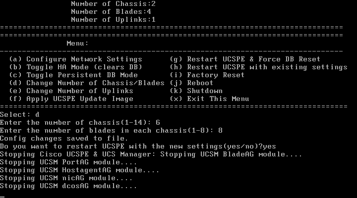After that process is finished you will get to login screen that ask you to use the user and password config in order to access the configuration menus of the UCSPE. From those menus you can set stuff like the number of UCS chassis to be used and the number of blades per chassis for example.