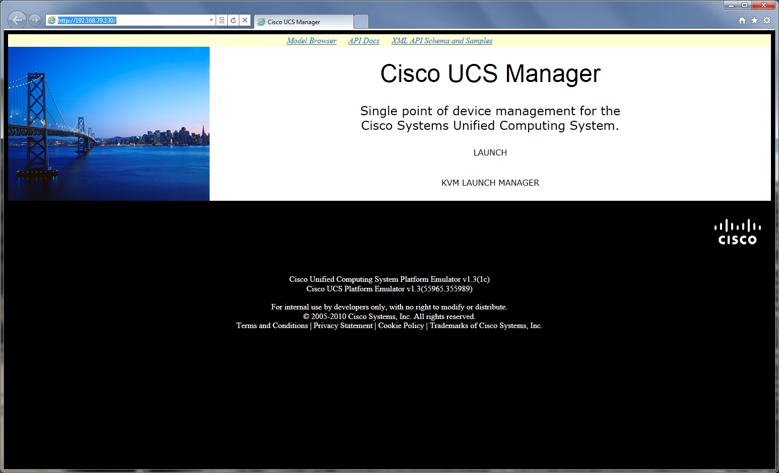 Once you have configured the emulator point your web browser to the IP address of the emulator to access the UCS Manager. The network the UCSPE virtual machines is connected to must be configured to provide IP addresses with DHCP, I used the default NAT network the UCSPE came with. When you are in the web browser click the LAUNCH link.