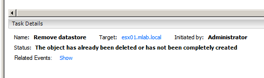 I quickly switched to an SSH session in the vMA to check the state of the datastore, it appeared as not mounted.