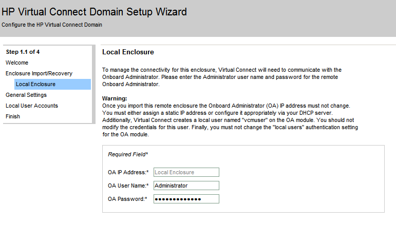 After the informative screen the first step will display. Here you have to provide the enclosure Onboard Administrator IP address and credentials, these credentials must have administrative level. Click next when finish.