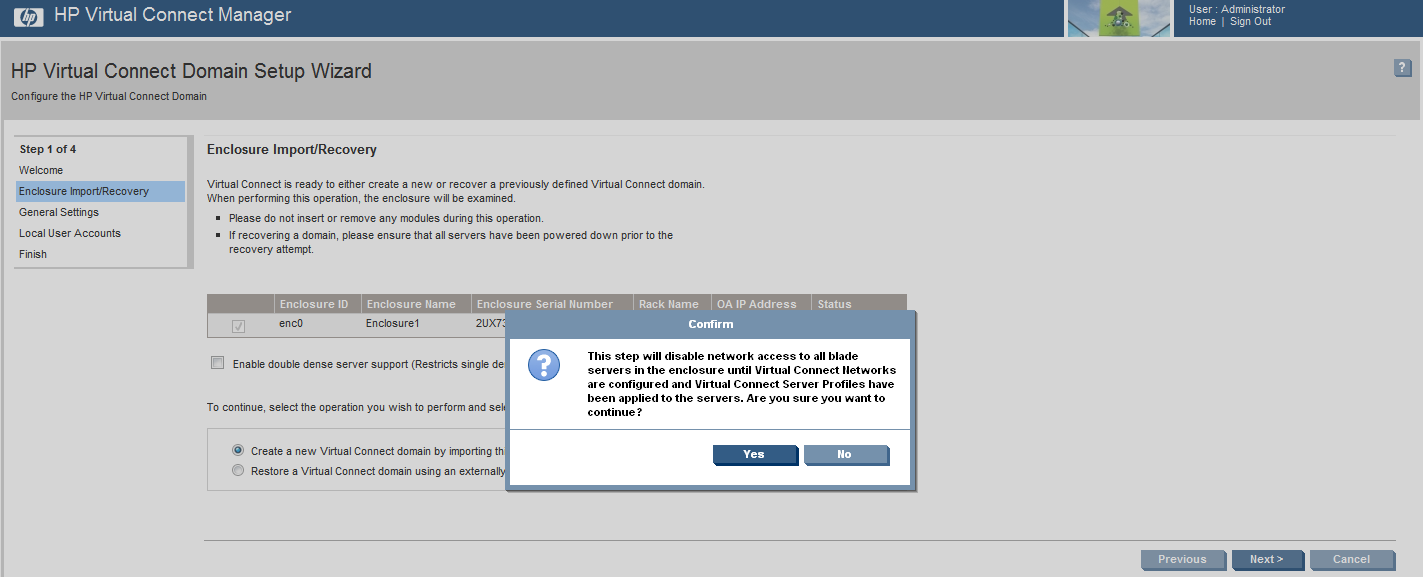 A pop-up will show up to inform that the networking of all the blades within the enclosure will be disabled until VC Networking is properly configured. of course it will ask for confirmation.