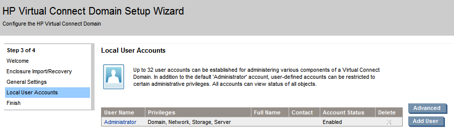 By default the only local account is Administrator, this account cannot be deleted nor have domain privileges removed. You can also add up to 32 accounts with a combination of up to four levels of access. The available levels are: