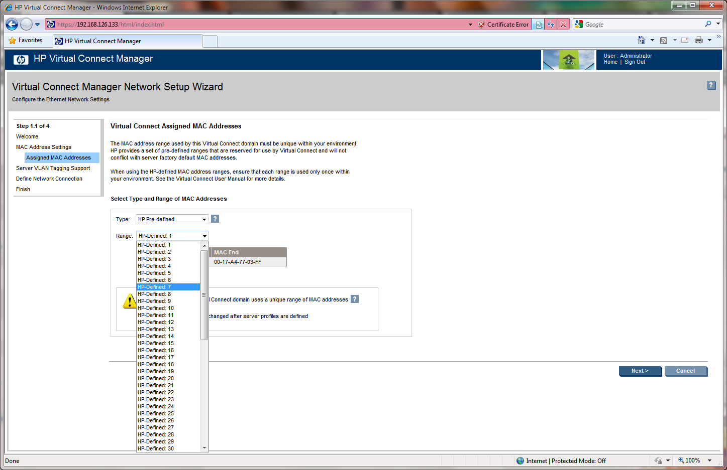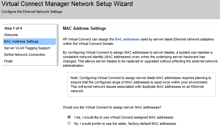 The first screen of the wizard is the MAC Address Settings. As every server in the market the HP Blades come with factory-default MAC addresses already assigned to their network cards. However Virtual Connect can override these values while the server remains in the enclosure.