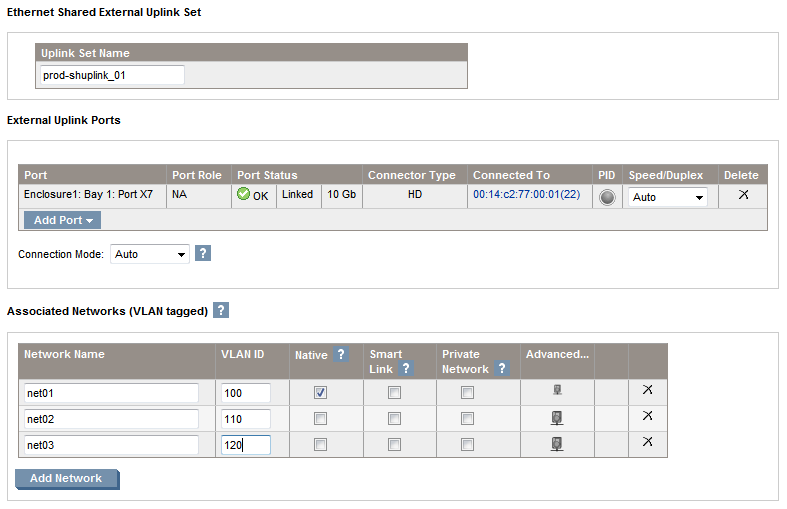 A shared uplink is the way Virtual Connect has to identify which uplinks carry multiple networks over the same cable. On shared uplinks the VLAN tags are added when packets leave the enclosure and added when leave. The external switch and the Virtual Connect Manager must be configured with the same VLAN tag ID for each network on the shared uplinks. The uplinks enables multiple ports to be added in order to support port aggregation and link failover, with a consistent set of VLAN tags. Virtual Connect has no restriction on which VLAN IDs can be used so the VLANs already used in the external infrastructure can be used here.