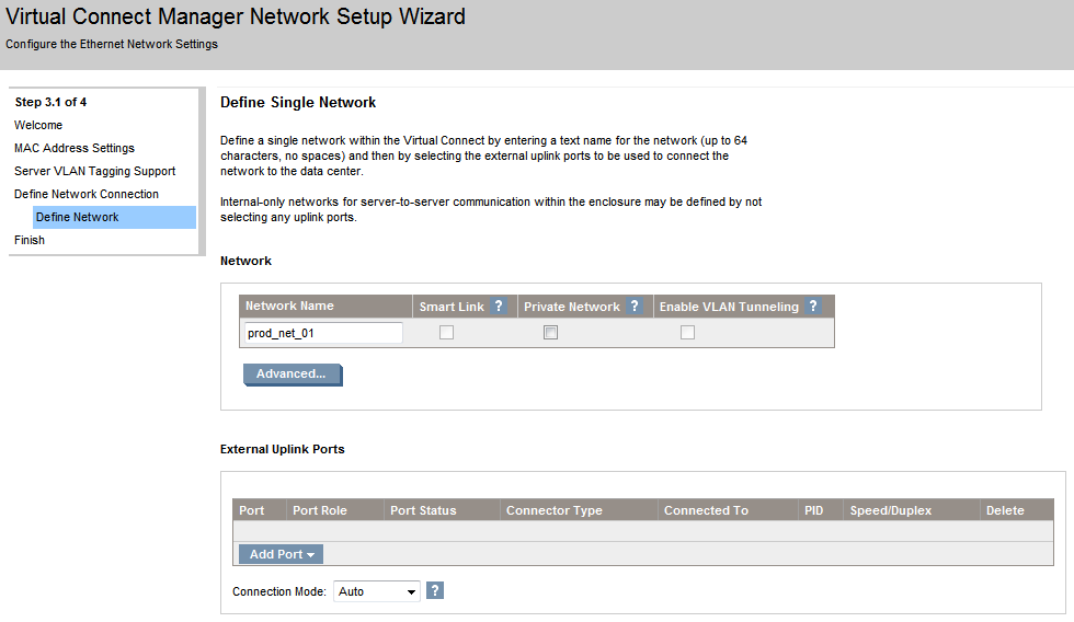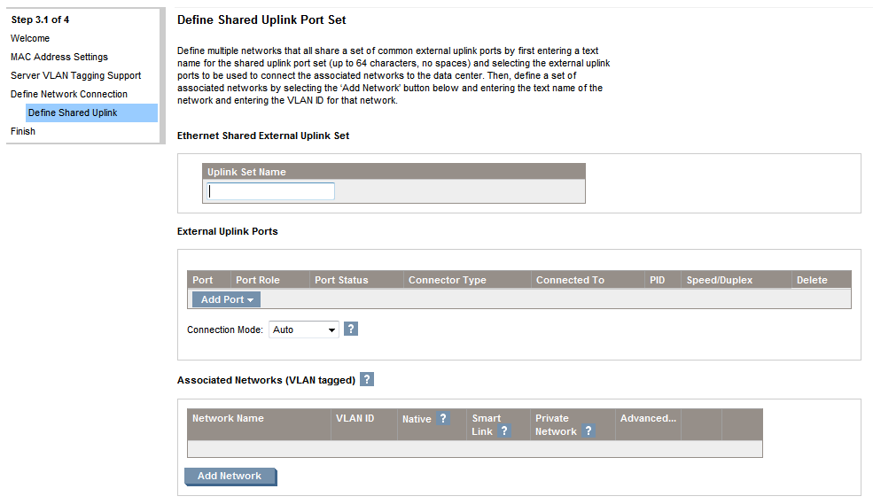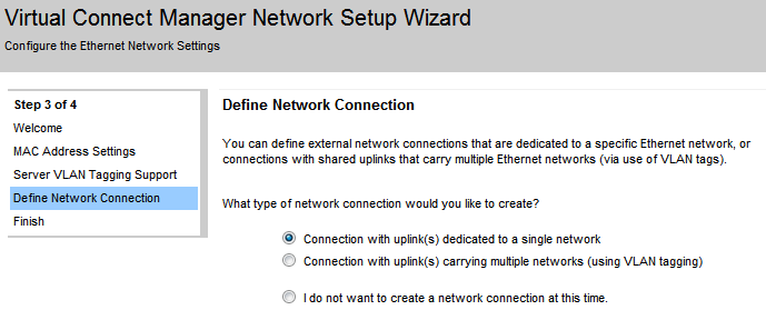 The Virtual Connect Network Setup Wizard will help to establish external Ethernet connectivity for the enclosure. With this wizard you will be able to: