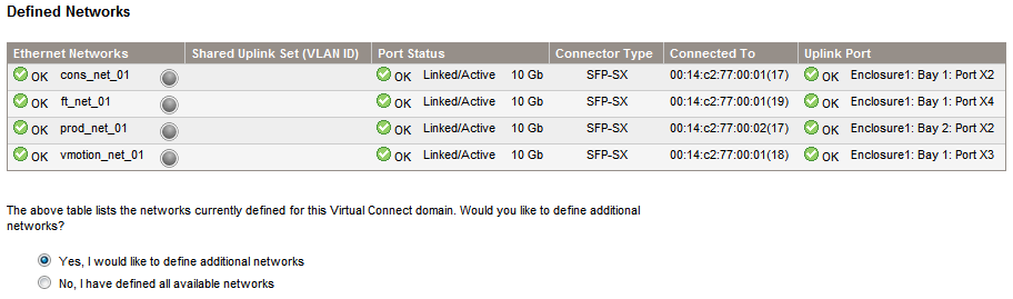 In the final screen you will see now the three networks associated to a Shared Uplink Set. You can check this also from the Virtual Connect Manager page in the Ethernet Networks area.