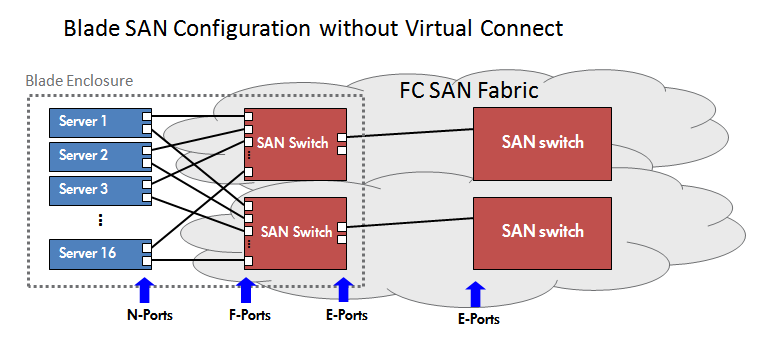And how manages Virtual Connect all this port stuff? I believe that an image is worth a thousand words, so first I will show with the below diagrams illustrate how FC ports and SAN are managed with and without Virtual Connect.