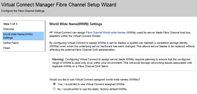 In this first page you can specify if you want to use the WWN settings that comes with the Fiber Channel HBA card or if the HP Virtual Connect supplied WWN settings.