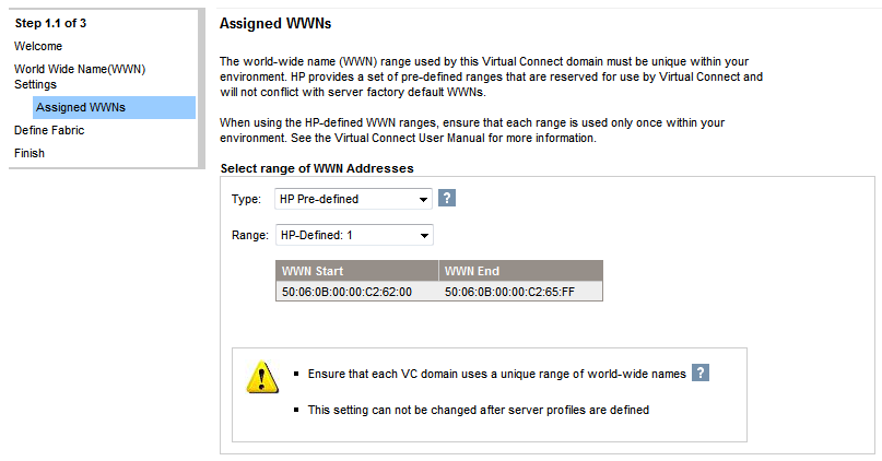 This screen is very similar to the MAC address range selection screen we saw in the previous post. Here you have to choose between an user defined WWNs range and an HP defined one. You must ensure that the selected range is unique within the environment.