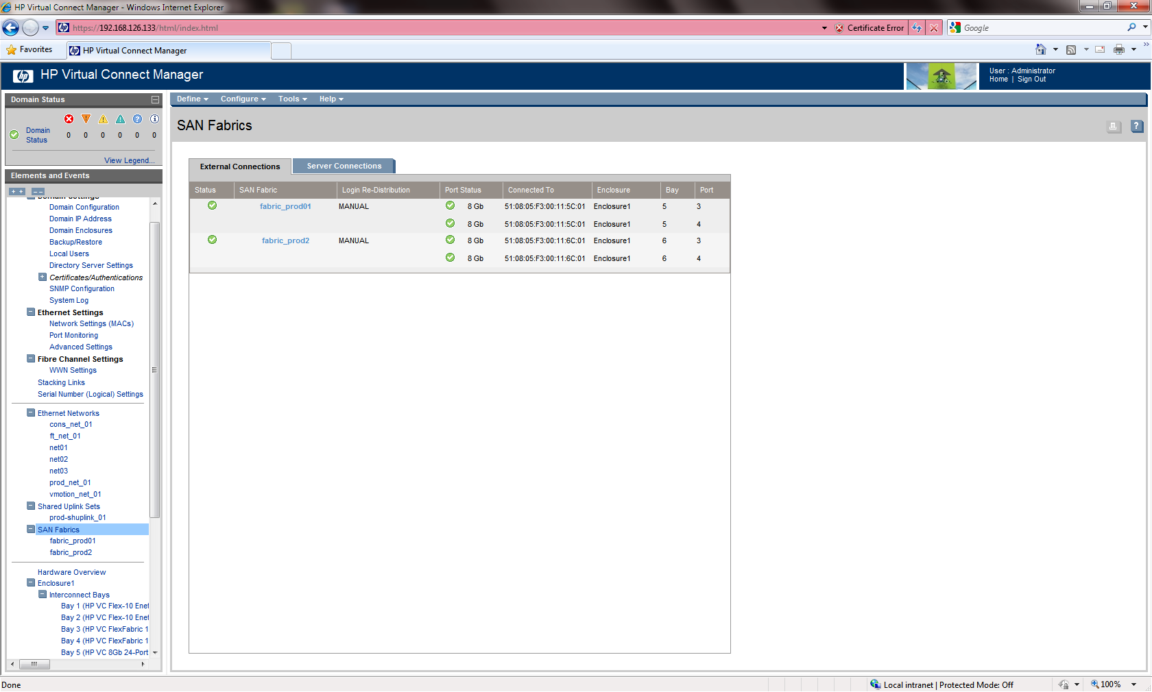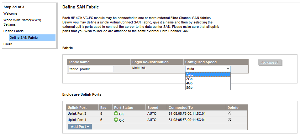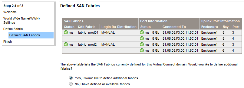 When you are done with the second fabric finish the wizard and the storage setup will be done. You can review and modify the configuration from the Virtual Connect main interface.