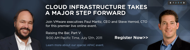 Tomorrow, Tuesday July 12th, VMware CEO Paul Maritz and CTO Steve Herrod will host a worldwide online event titled “Raising the Bar, Part V”. In this event they plan to make an announcement about the next generation of Cloud infrastructure.
