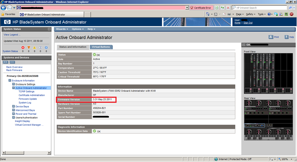 Finally log into the OS and from the Active Onboard Administrator screen check the OA version.