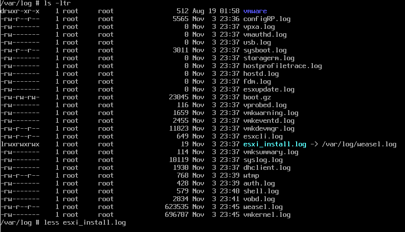 At this point and before restarting the host if you go back again to the ESXi console you can review the ESXi install log file, called esxi_install.log which in fact is a symlink to the file weasel.log.