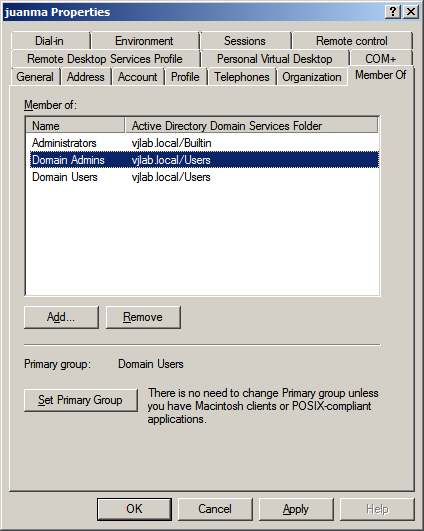 On the right pane edit the properties of the account you want to be able to access the linux server via SSH. In my case I used my own account juanma. In the Member of tab select the Domain Admins group and click Set Primary Group.