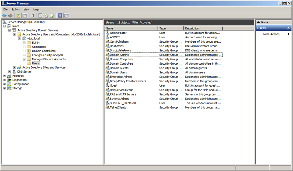 Fire up Server Manager and go to Roles -> Active Directory Domain Services –> Active Directory Users and Computers –> DOMAIN –> Users.