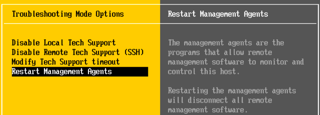 Everything looked exactly as it should be, no error logs, nothing. At this point I decided to restart the ESXi management agents.