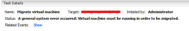 Last night during a patching job in a customer I found the following error for several VMs when I put a host in maintenance mode and DRS tried to evacuate the virtual machines to the other nodes of the cluster.