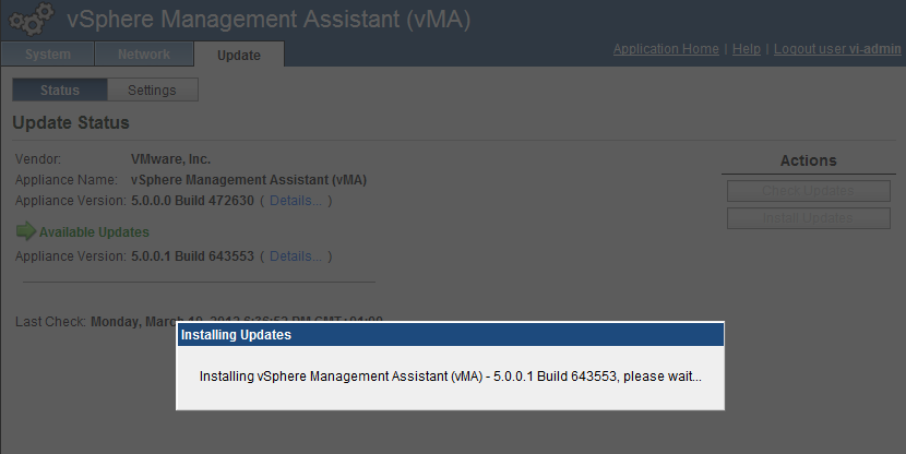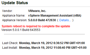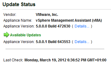 As you should remember from my first post about vMA 5 the classic vma-update utility is no longer available. So to be able to update our vMA to the new version we have to use the Web UI. Following is the procedure to perform the upgrade.
