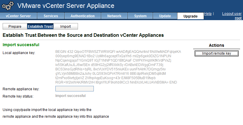 Go back to the vCSA 5.1 and copy the Local appliance key. On the 5.0 appliance click on Establish Trust and paste the copied key in the Remote key appliance key field. Click on Import remote key and wait for the import to complete.
