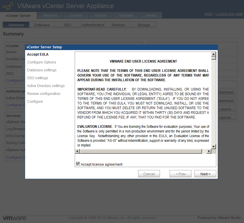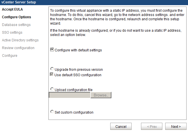 Deploy the appliance as shown above, log into the WebUI and in the wizard accept the EULA in the first screen and select Upgrade from previous version in the second, let Use default SSO configuration as it comes by default.