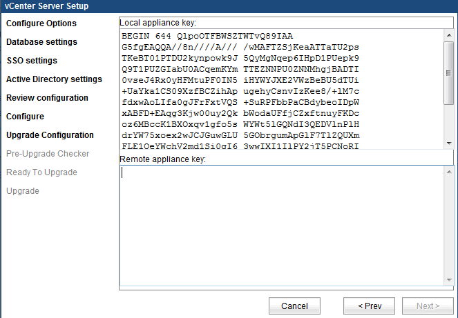 In the vCSA 5.0 copy the Local appliance key. Go to 5.1 vCenter, paste that key on the Remote appliance key field of the setup wizard screen and click Next. The Pre-Upgrade Checker screen will show up.