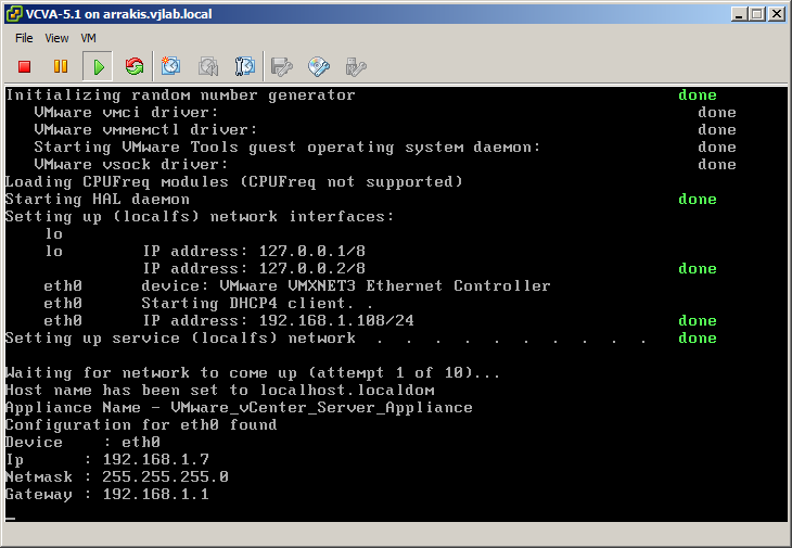 Let the deployment process finish and power on the vCenter appliance. During the boot process you can see how the network configuration is applied to the VM.