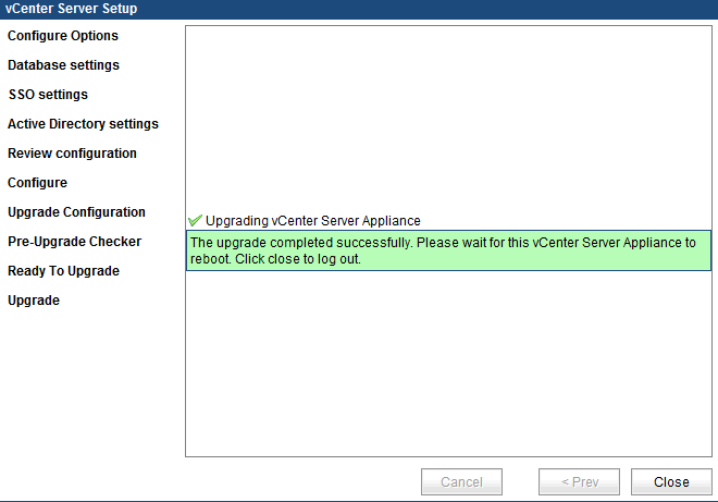At the end if everything goes fine you will see a screen with a confirmation, click close and will see al the vCenter services up and ready in the main screen of the WebUI.