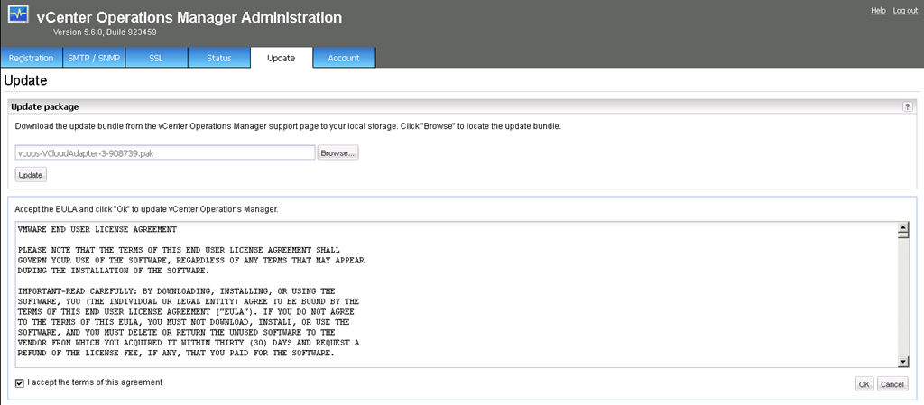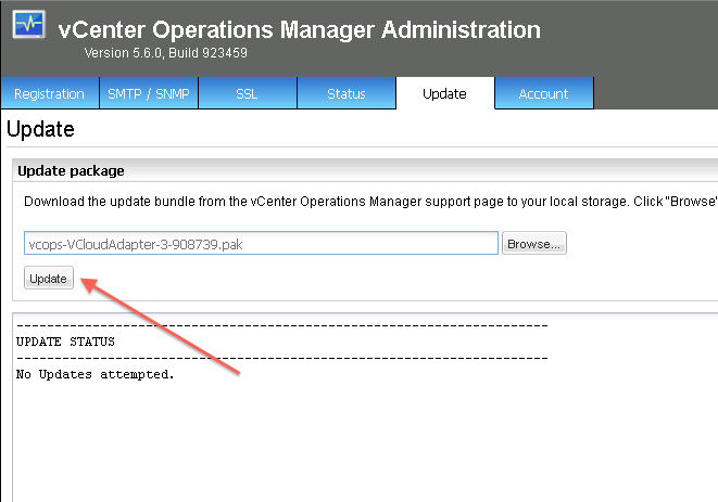 Once it is downloaded log into vC Ops Admin UI https://vcops-ui-vm/admin. From the Update tab browse for the downloaded file and click Update.