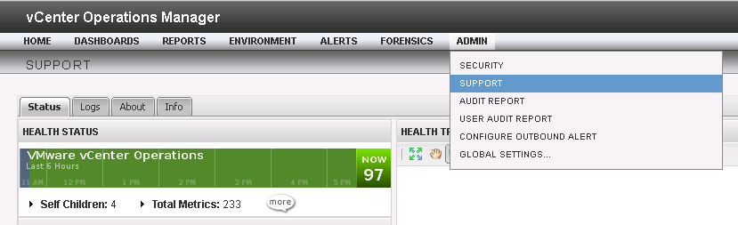 Once the vCloud Adapter installation is done proceed to vCenter Operations Custom UI https://vcops-ui-vm/custom. From the Admin menu go to Support.