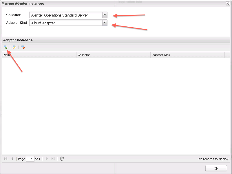 From the Environment menu select Configuration -> Adapter Instances. Select the vC Ops Server collector and the vCloud adapter from the drop down menus. Click on Add New Adapter Instance.