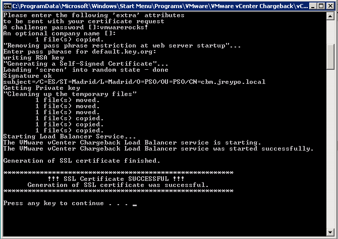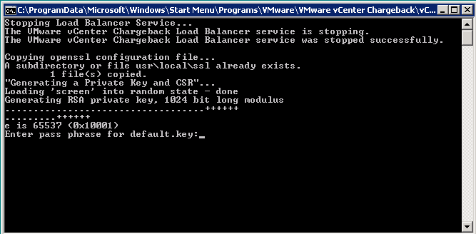 After we can launch the generation process. The batch file will open a cmd window, stop the CBM Load Balancer service and asks for the passphrase of default.key. You’ll have to enter it three times and after that the process will ask for information about the State, City, common name (usually the server FQDN), company name, email, etc.