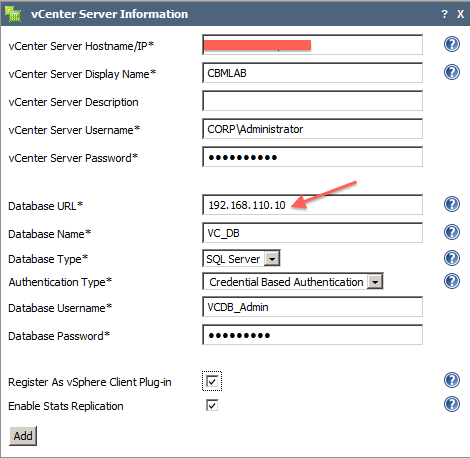 The first task you want to perform after Chargeback installation is to add a vCenter Server, in theory pretty easy until you get to the database screen. It is very important to remember that in the Database URL field you only need to put the database server IP address as shown in the screen capture.