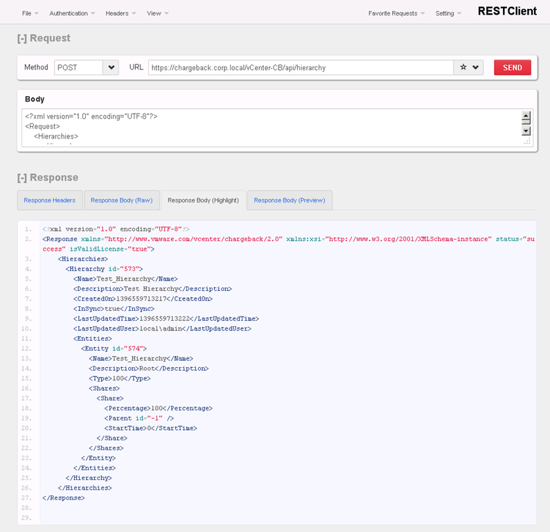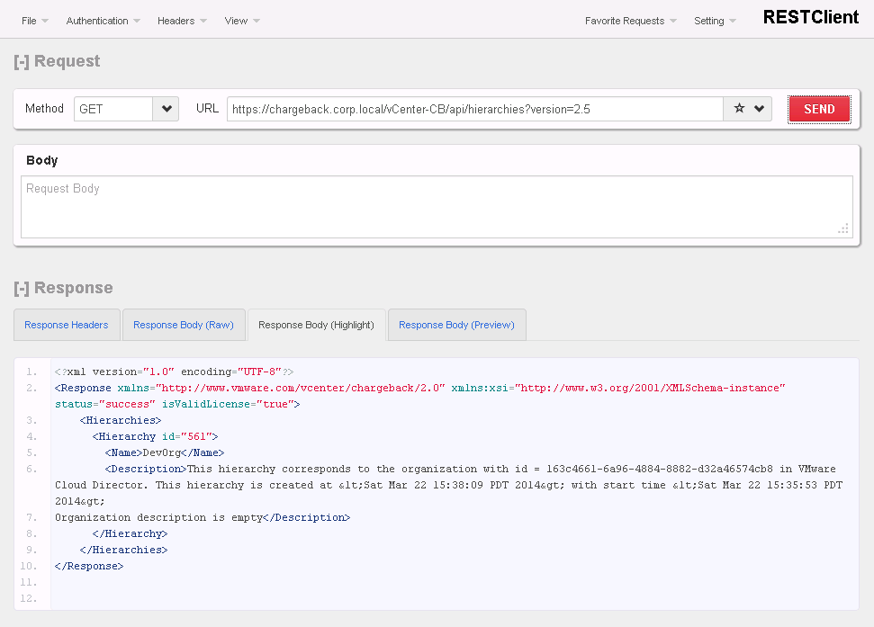 Not every task needs an XML payload, in the following example we are going to get a list of the hierarchies using a GET method and with no message body. The URL to make the request would be: