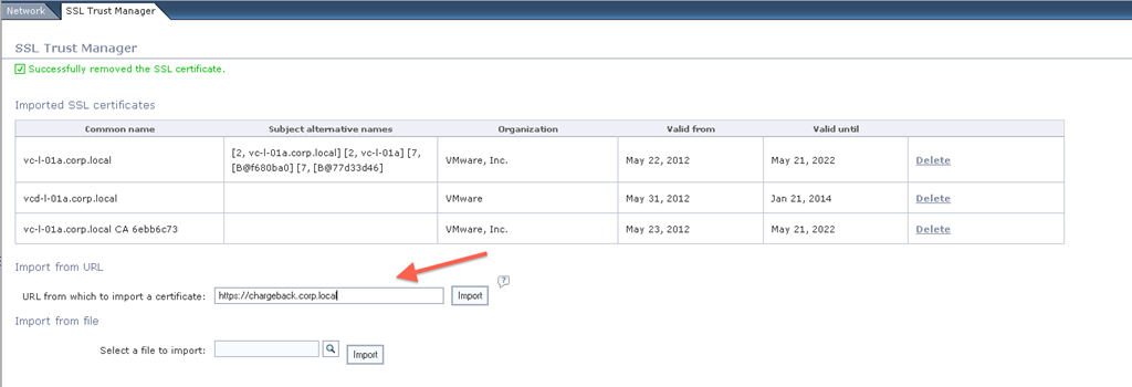 Next we need to import Chargeback SSL certificate, go to Network and then to SSL Trust Manager tab. Enter Chargeback server URL in the Import from URL textbox and click Import.