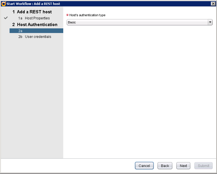 We need to add first our Chargeback server as REST host. Launch the Add a REST host workflow. Enter the name of the REST host and the base URL for the API, leave the timeout settings with the default values.