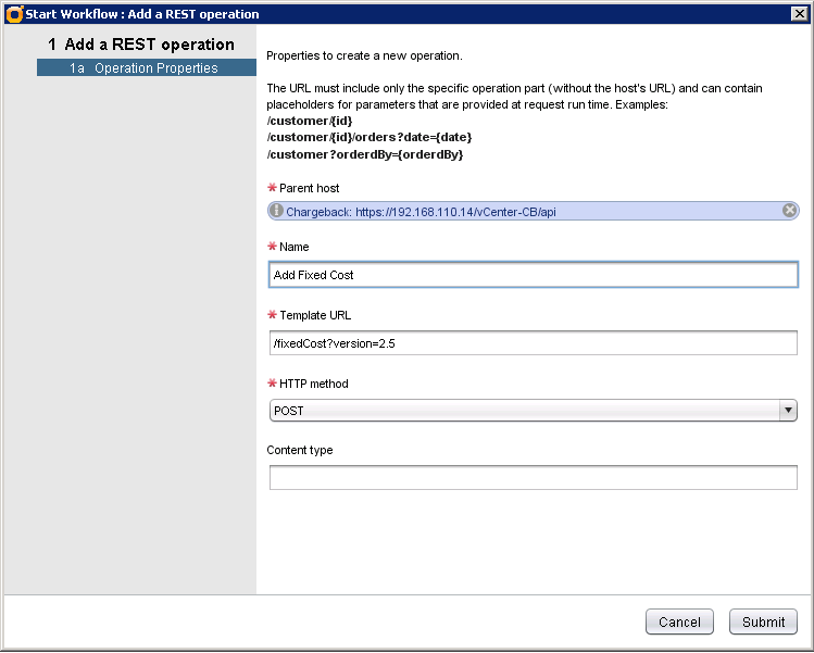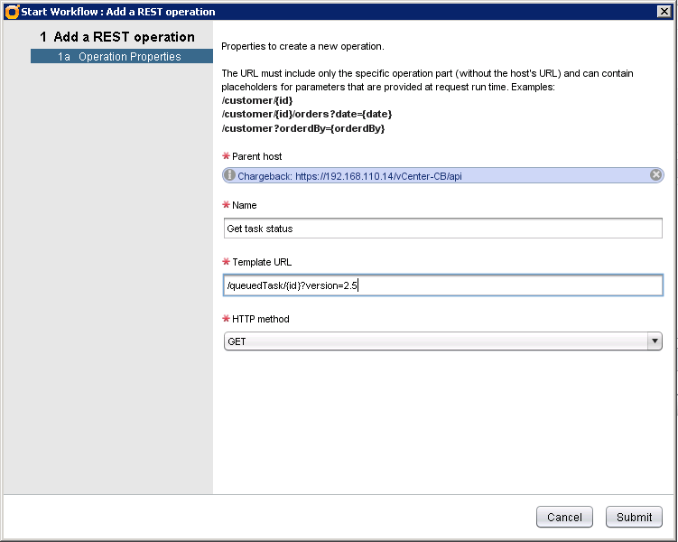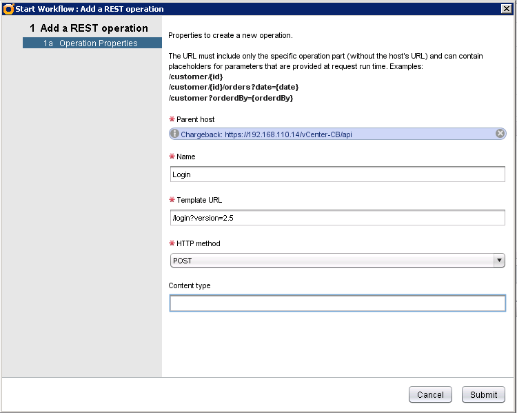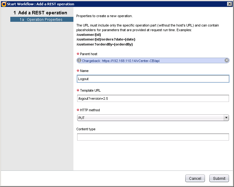 Launch Add a REST operation workflow and enter the following parameters: