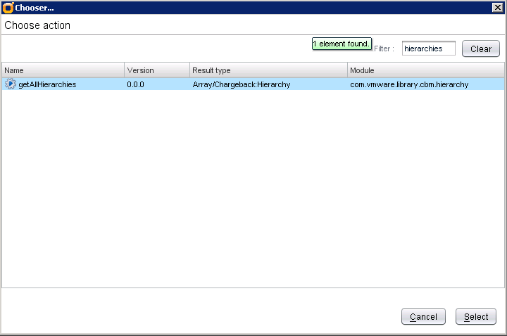 You should be thinking that this example is a bit silly, and to be honest it is. There are few use cases that will require to dump the hierarchy list to vCO log. The purpose of this workflow is to illustrate Chargeback plugin Action elements. Open vCO API Explorer and have a look at all the already implemented Actions that can be used in your workflows.