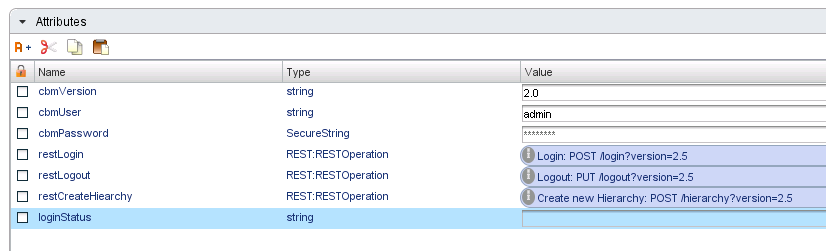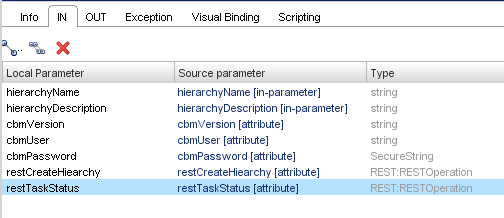 Next edit the Create hierarchy element. Bind restCreateHierarchy, cbmUser, cbmPassword and cbmVersion attributes as input parameters, also bind hierarchyName and hierarchyDescription as input parameters.