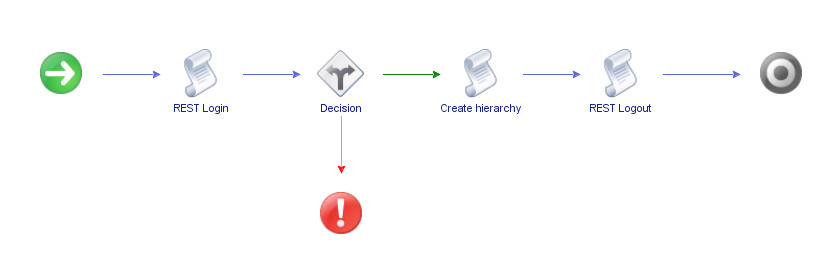 Add two Scriptable tasks to the workflow, name the first as API Login and the second as API Logout and paste the code from the previous Login and Logout examples. Now add a third scriptable task to be executed after the login, name it as *Create Hierarchy and edit it. Paste the below code in the Scripting tab.