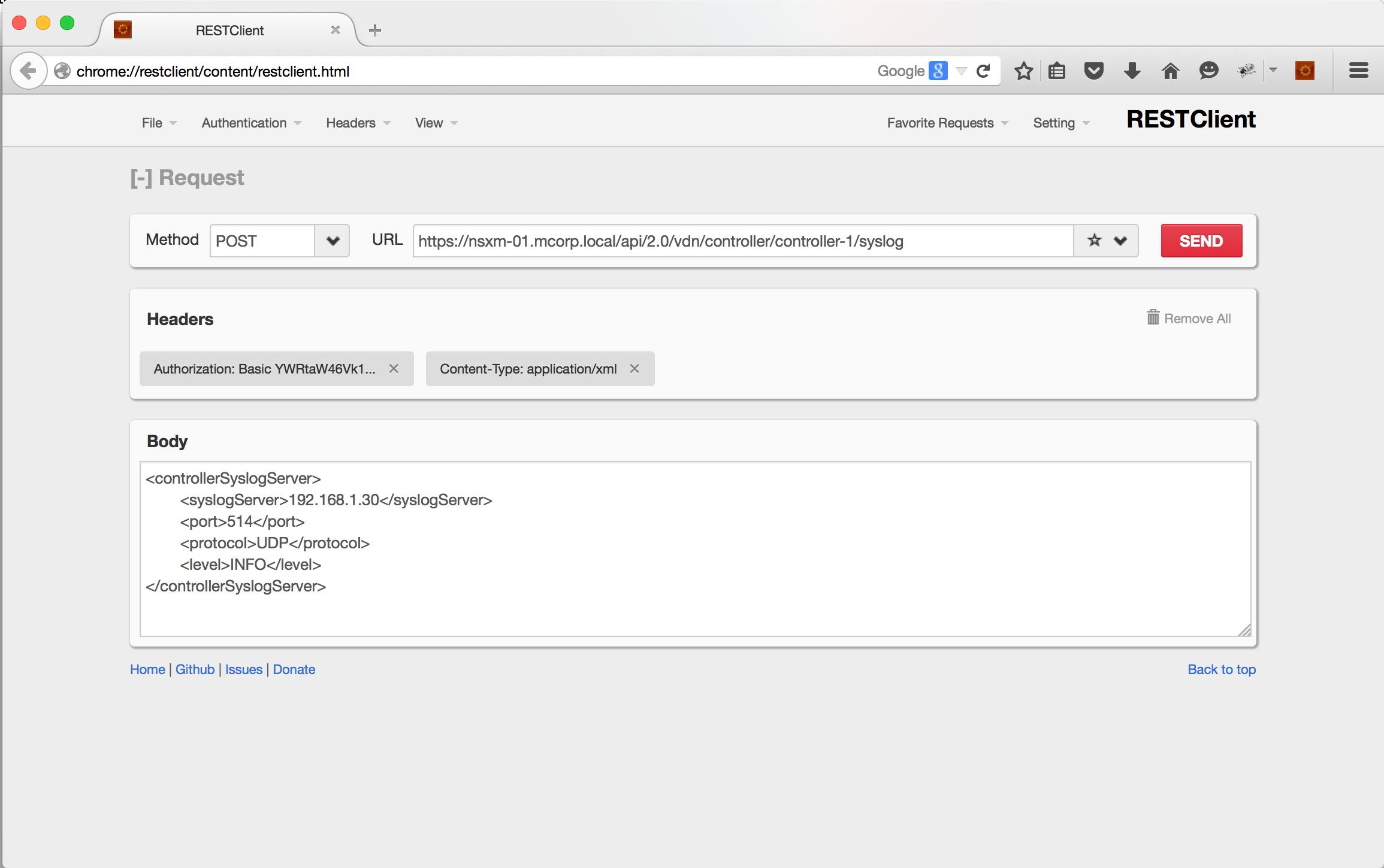 At this point the syslog server is configured for all NSX Controllers, you can check the status using also an API call with the same URL and selecting GET method.