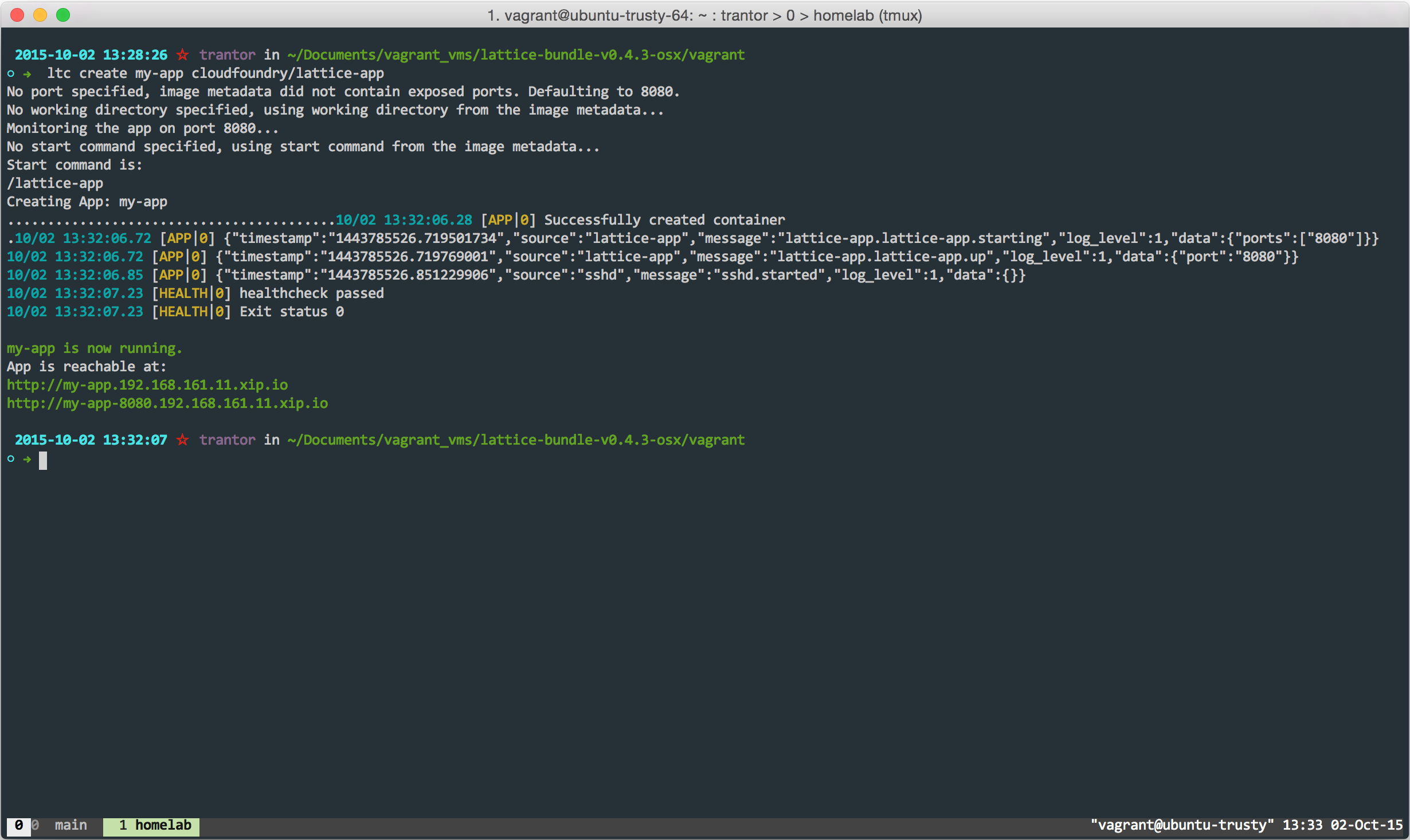 With the API endpoint set let’s deploy our first application, for this example we will use Lattice example app. Run the ltc create command with the name of the new app and the container to be spun up as the arguments.