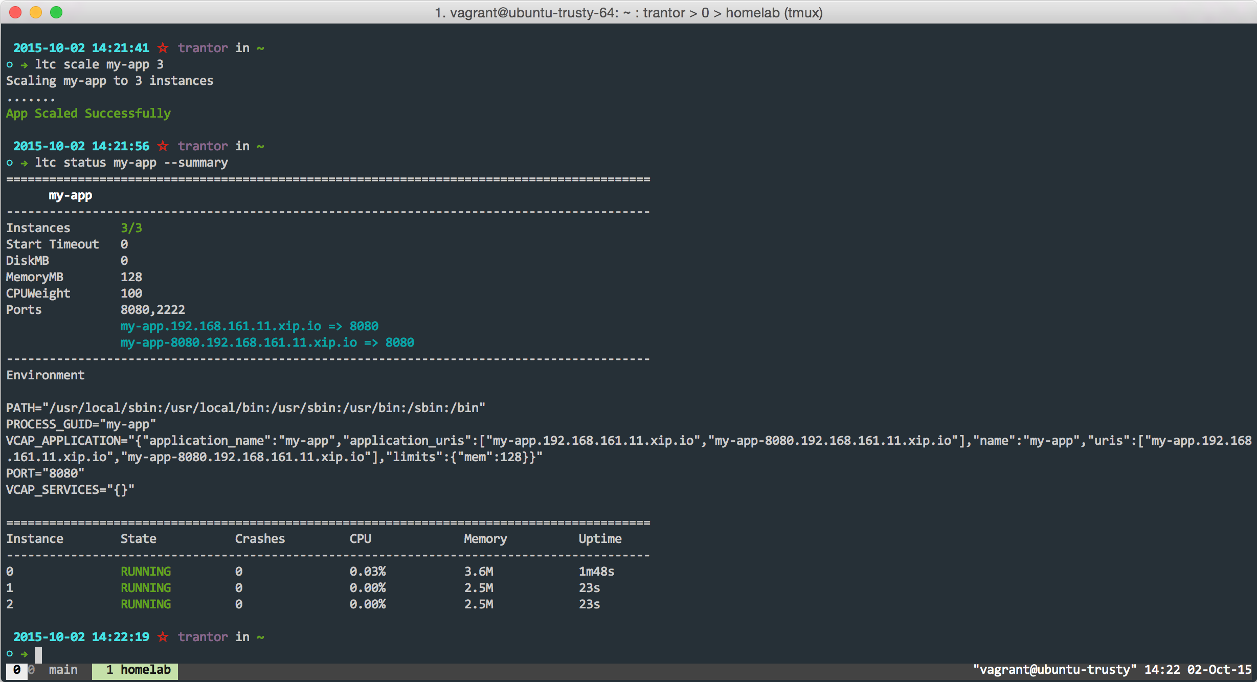 The index indicates the node that we are accessing. Next we will scale up the application adding two additional containers. Use ltc scale to add additional instances of the app and ltc status to retrieve the status.
