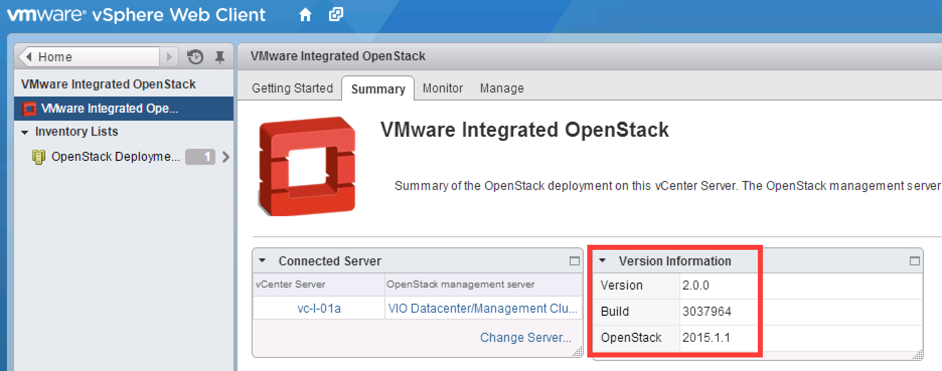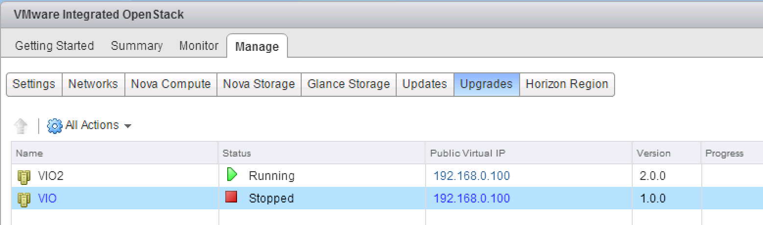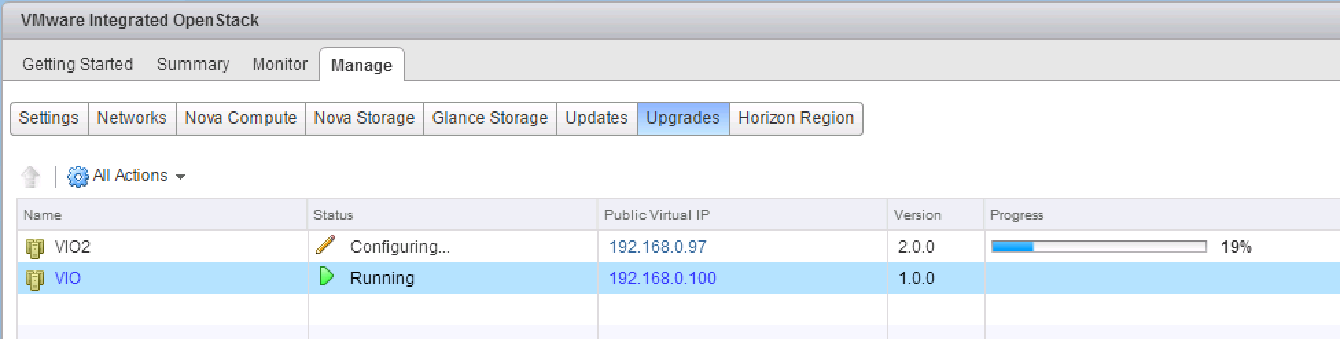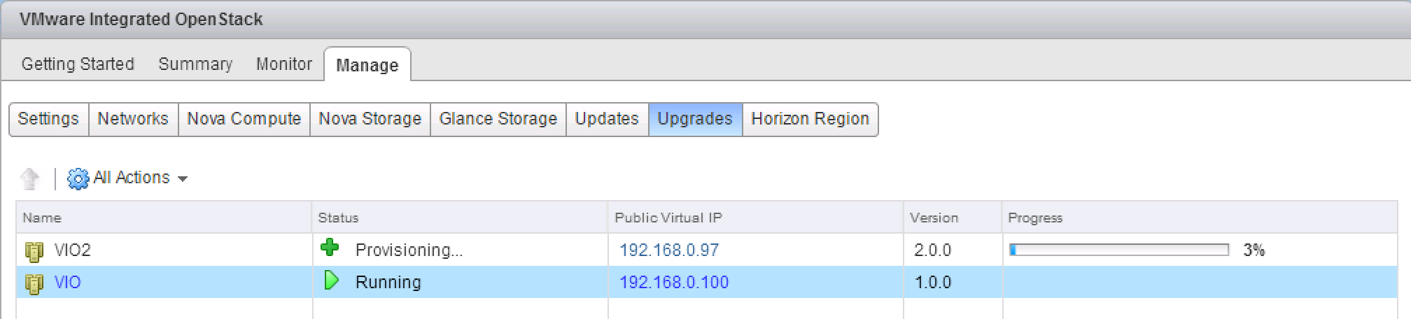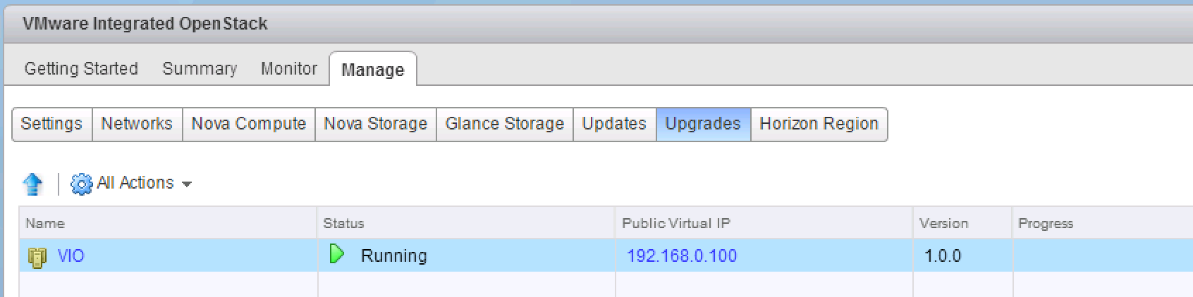 With VIO Management Server upgraded is now time to deploy a fresh 2.0 environment. In the VIO plugin go to Manage section and a new Upgrades tab will be there. Before