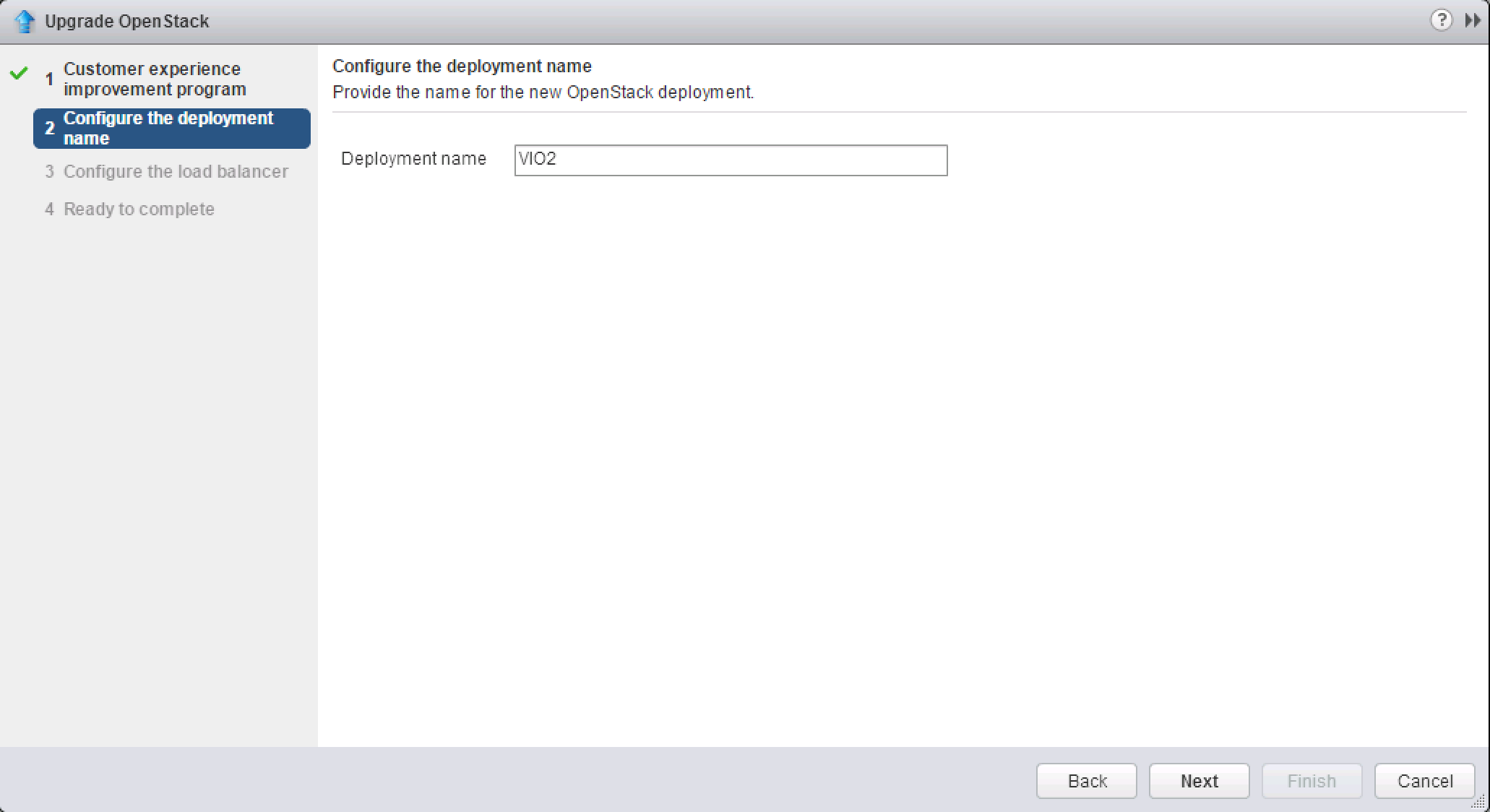Click on the Upgrade icon. Select if you want to participate in the Customer experience improvement program, my recommendation here is to say yes to help our engineering team to improve VIO upgrade experience even more ;-), and enter the name for the new deployment.