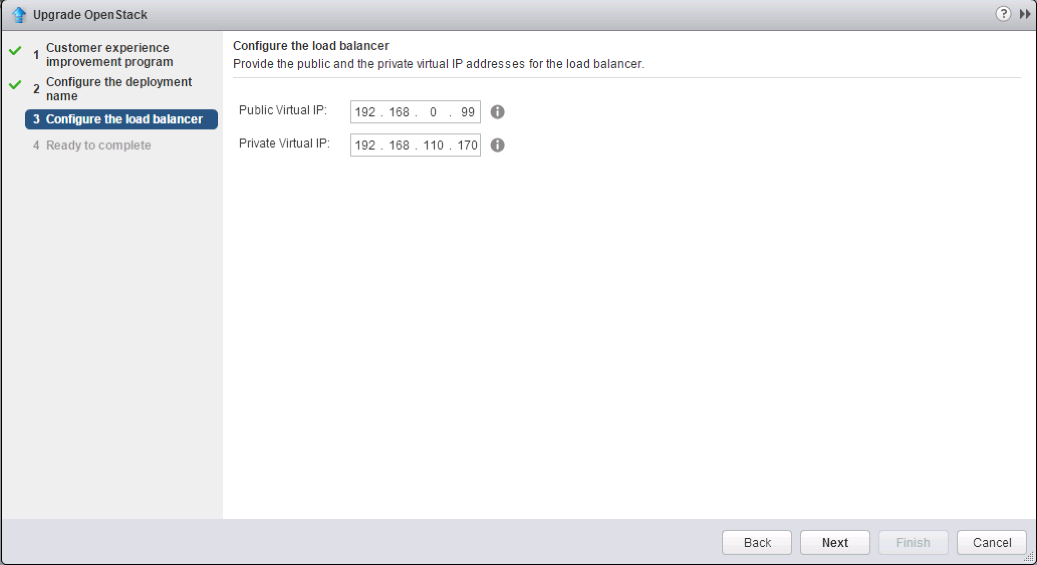 Enter the IP addresses for the public and private load balanced IP addresses, keep in mind that these IP addresses must belong to the API subnet of the existing VIO 1.0 environment in case of the public and to the management network segment in the case of the private one.