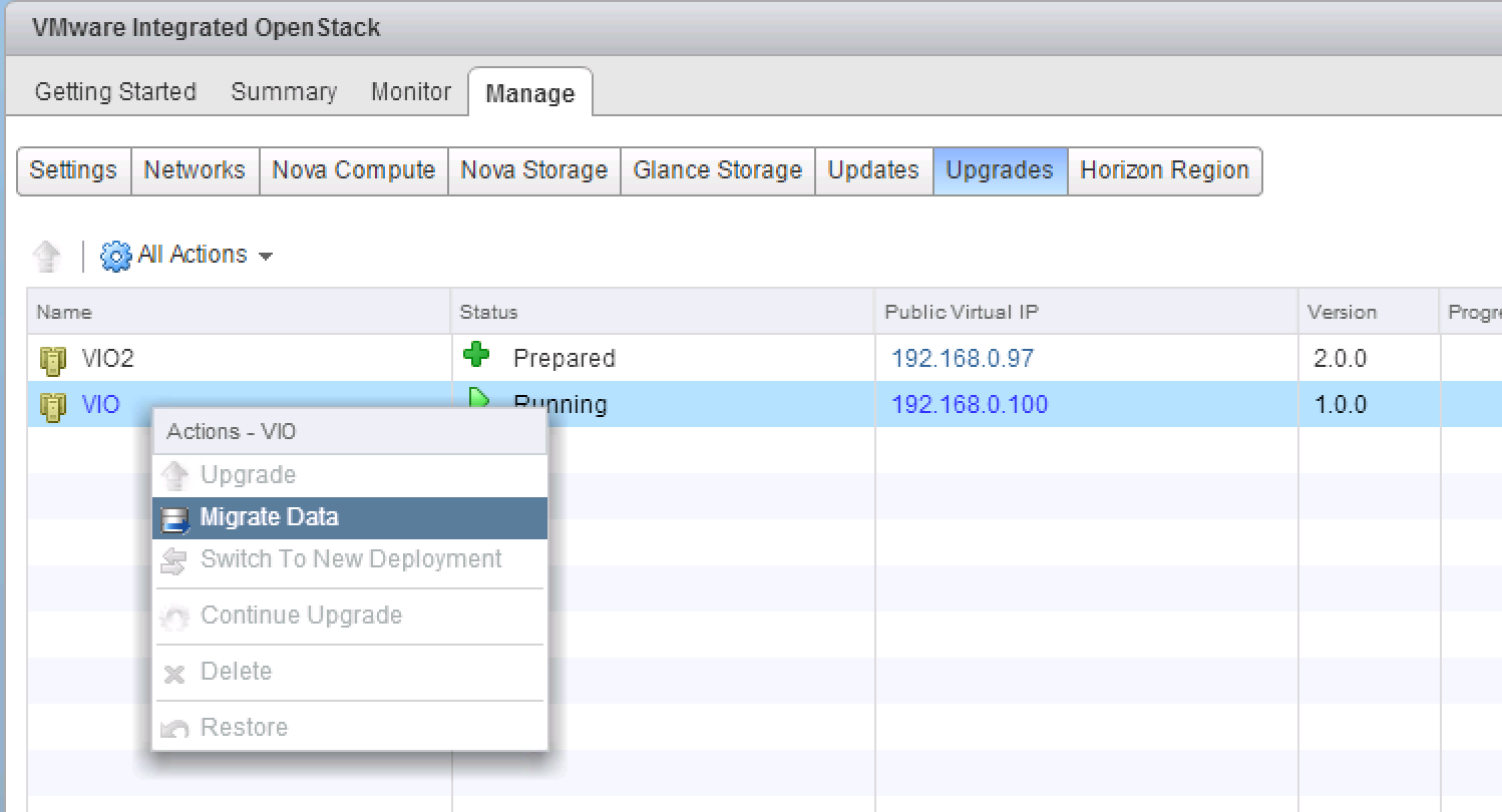 With the new environment up and ready we can start the data migration. From the Upgrades tab right-click in the your existing VIO 1.0 installation and select Migrate Data.