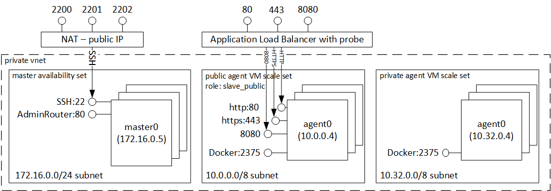 There are also two load balancers with two public IP addresses, one for each. One load balancer is for the master and the other for the agents.
