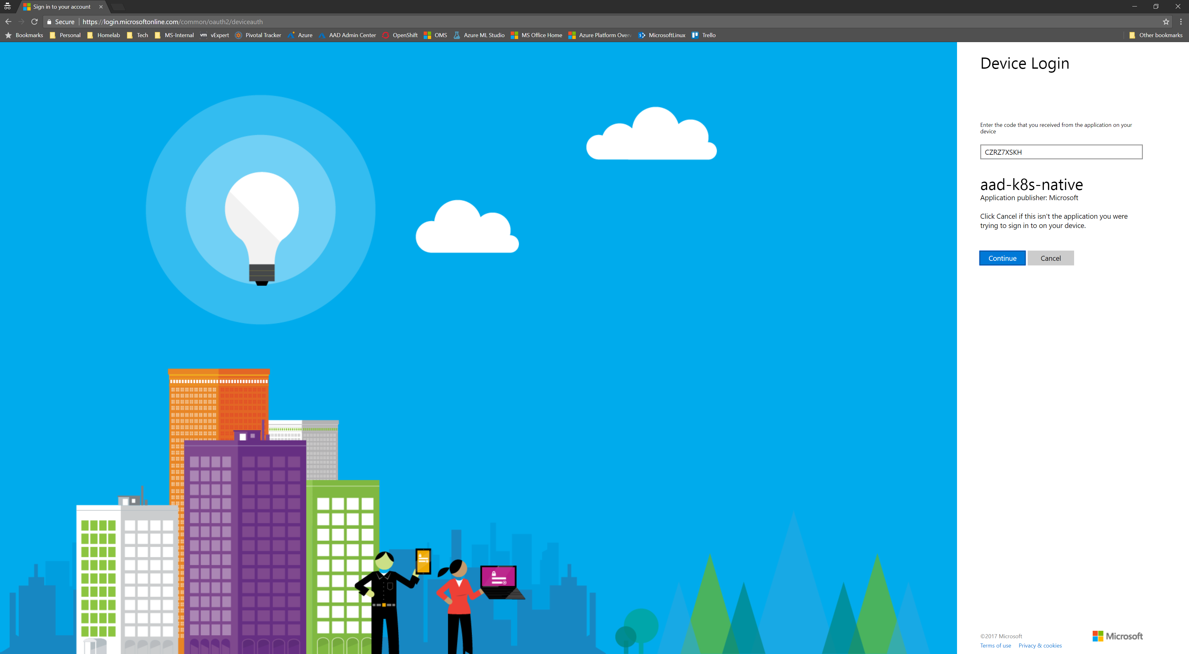 Open a browser access the https://aks.ms/devicelogin URL, enter the code and login with the account configured in the cluster role.